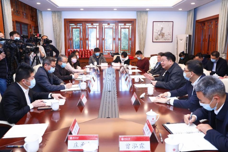 12月31日上午,国台办副主任龙明彪,北京市委常委、统战部部长游钧,国台办交流局局长黄文涛,北京市台办主任霍光峰一行访问北京大学并慰问台籍师生代表。北京大学党委书记邱水平、党委副书记安钰峰在临湖轩会见来宾。