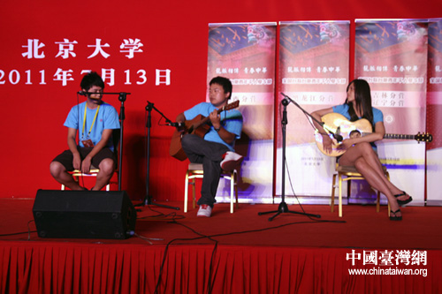 未名湖畔、博雅塔下、图书馆前,来自台湾的青年朋友们与北大同学共叙人生话题,畅谈青春理想。两岸的青年学子们相邀合影,校园里洒下了一串串欢声笑语。当晚的联欢活动由两岸青年共同主持共同表演,节目既有年轻人喜欢的吉他弹唱、街舞,又有体现中华民族传统文化的越剧《西厢记·琴心》及太极拳,更有“很潮”的舞台剧《非诚勿扰》,精彩纷呈。