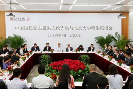 5月4日下午,中国国民党主席朱立伦访问北京大学,并与师生代表座谈。中国国民党副主席黄敏惠,中国国民党主席特别顾问、大陆事务部主任高孔廉,中共中央台湾事务办公室副主任陈元丰等陪同访问。